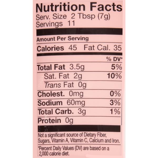 Per serving size 1 ½ tbsp (7g) contains 40 calories, 3g total fat, 15mg sodium(1% of dv), 2mg calcium and 0 total sugars.